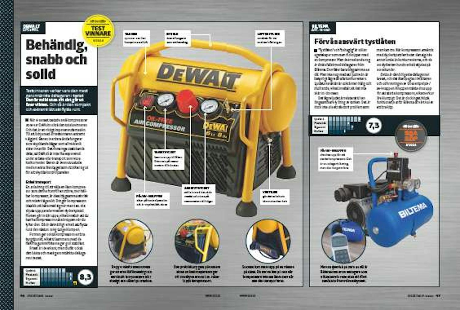 När vi senast testade små kompressorer 2019 var DeWalt också den totala vinnaren. Och det är en riktigt imponerande maskin. Till att börja med är testvinnaren extremt välgjord. Benen i vardera ände fungerar som skyddande bågar som all mekanik sitter innanför.