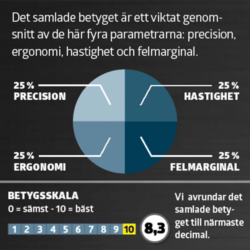 Det samlade betyget är ett viktat genomsnitt av de här fyra parametrarna: precision, ergonomi, hastighet och felmarginal.