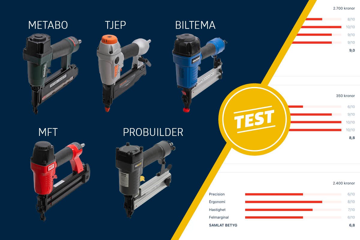 Du kommer att ha stor nytta av en spikpistol om du ska sätta igång med ett större jobb som att sätta nytt innertak eller ett stort renoveringsprojekt med reglar och panel. Alla maskinerna är snabba och testvinnaren skjuter 50 spik på 23 sekunder. De spikpistoler vi valt att testa går alla på tryckluft. Det betyder att du även måste ha en kompressor för att kunna använda verktyget. Men den billigaste batteridrivna spikpistolen från vårt senaste test kostade 3.295 kronor och var betydligt långsammare. Så även med en liten kompressor (som också kan användas till mycket annat) kan man komma långt med tryckluft.