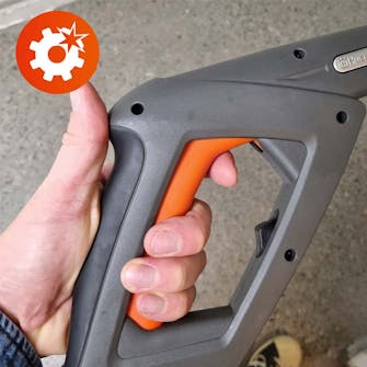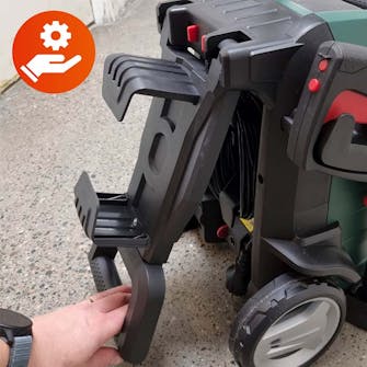 Det är generellt ett nöje att ha och göra med den blåa högtryckstvätten. Vikten är på en rimlig nivå, där det fortfarande är enkelt att flytta den. Och så kan handtaget fällas ihop, så att den totala höjden bara blir 60 cm – och det är med pistolen och lansen placerade i sina hållare. Den kan därför enkelt förvaras på en hylla eller under en bänk i verkstan.