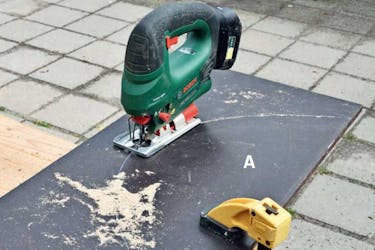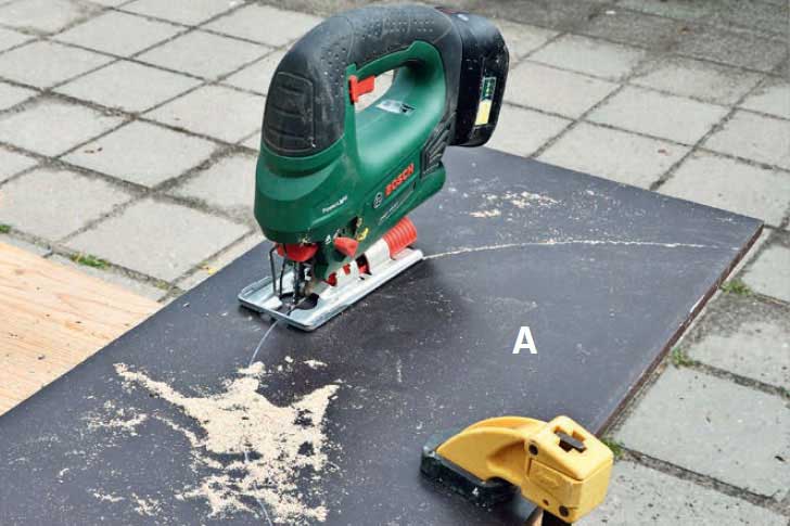 Såga ut bågen. Se till att spänna fast skivbiten (A) ordentligt och såga sedan efter strecket med en sticksåg.