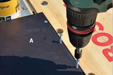 Spänn fast baksidan (B) och sätt trälim på den ena gaveln. Förborra till skruvarna i gaveln (A) med ett 4 mm borr och därefter genom dessa hål ner i kanten på baksidan (B) med ett 1 mm borr.
