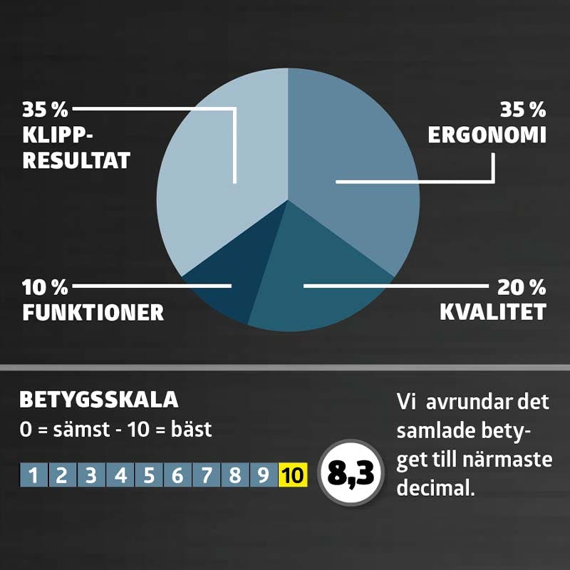 Gräsklipparna testas och betygsätts i de här fyra kategorierna; klippresultat, ergonomi, kvalitet och funktioner.