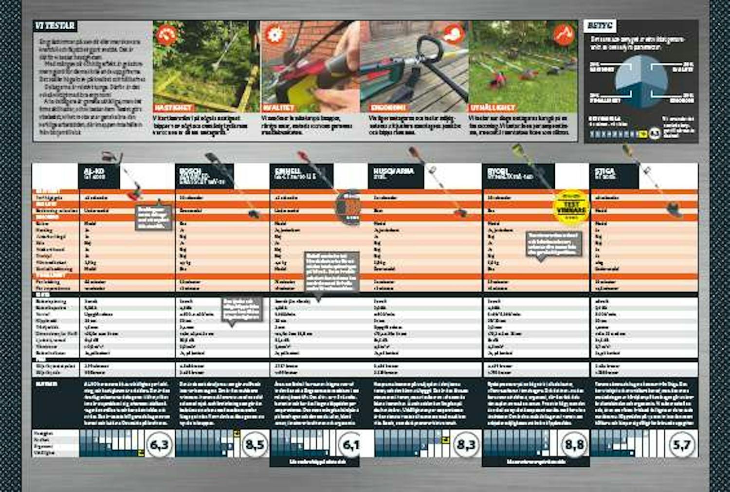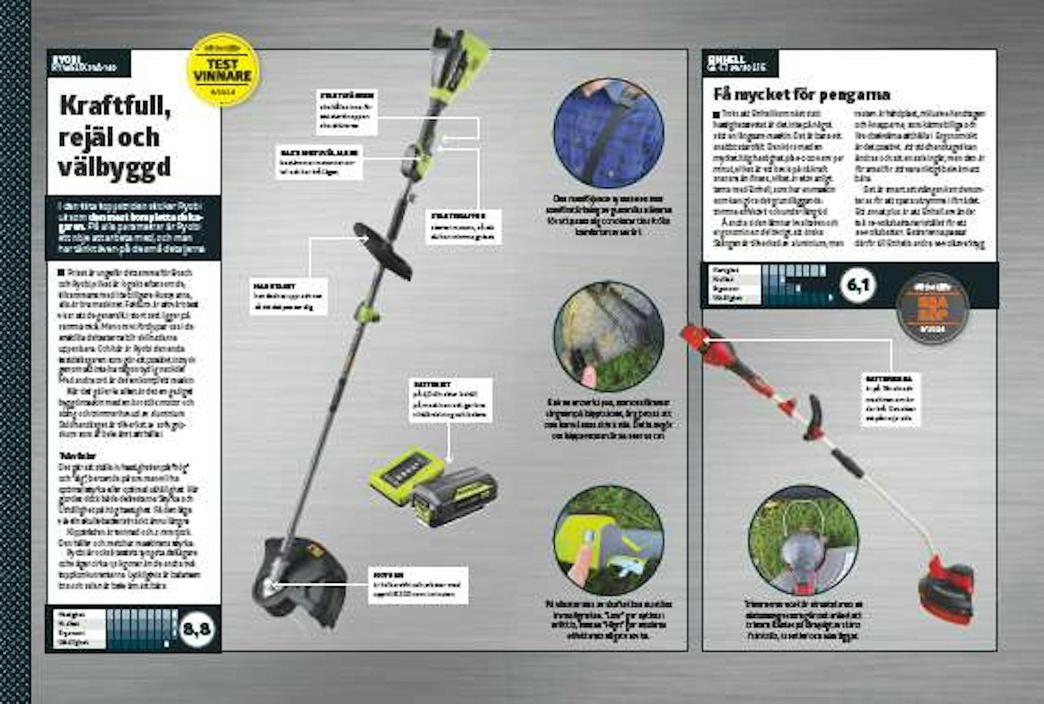 Ryobi presterar på en hög nivå i alla deltester, vilket resulterar i totalsegern. Och det trots att den bara vann ett deltest, ergonomi, där den fick dela förstaplatsen med en annan. Priset är högt, men det är också en mycket kompetent maskin med flera bra funktioner. Det är den enda deltagaren i testet som erbjuder möjligheten att ändra klippbredden.