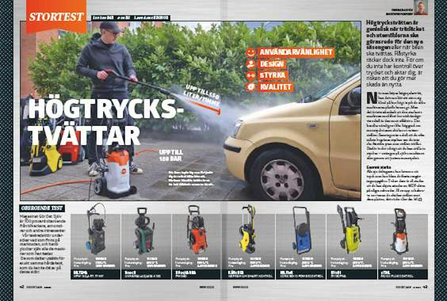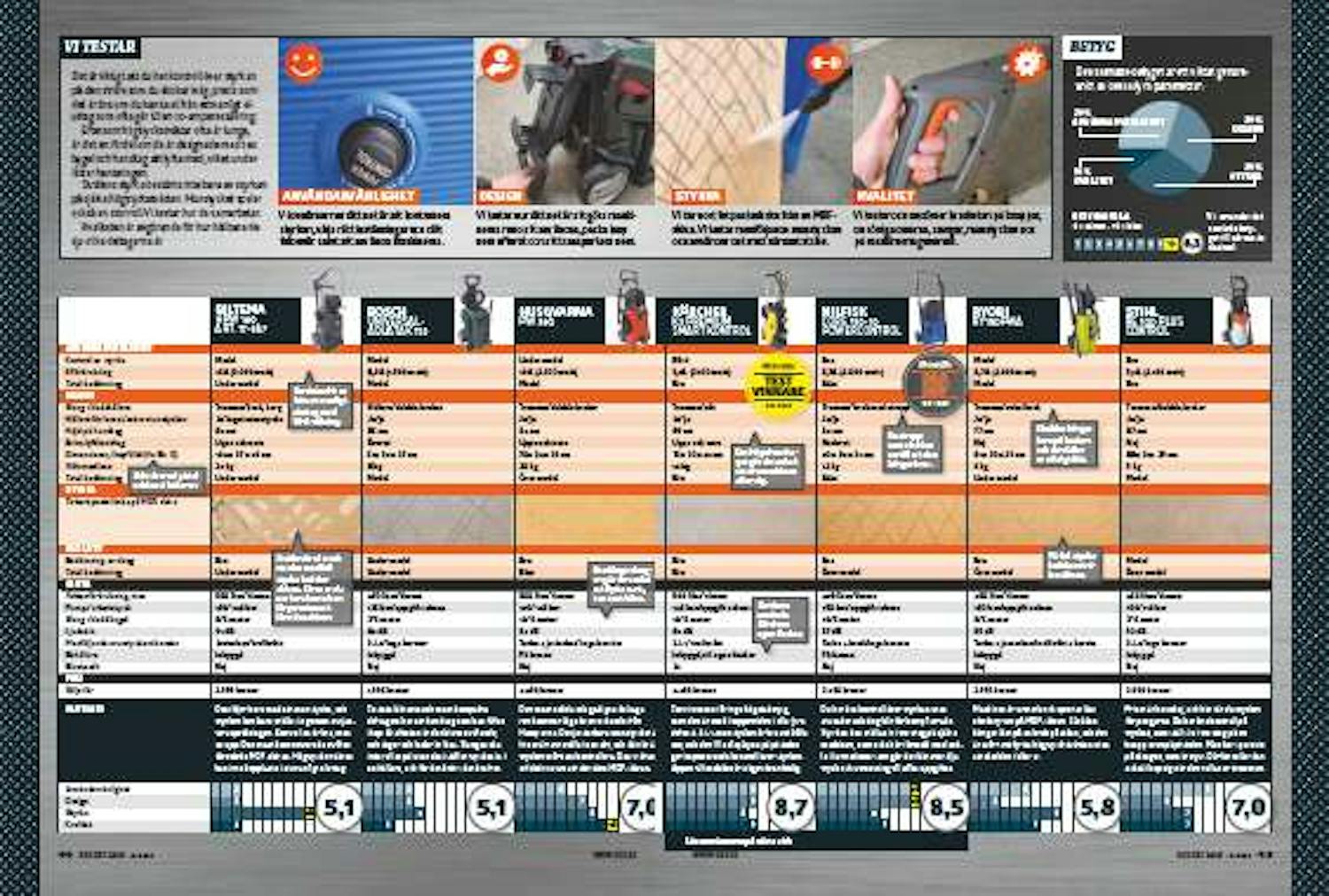 Alla sju deltagarna kan leverera ett tryck som kan klara de flesta rengöringsuppgifter. Två av dem är så starka att de kan skjuta sönder en MDF-skiva på några sekunder.