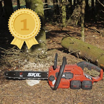 Motorsågen Skil 2 x 20 V har en borstlös elmotor som drivs av två 20-voltsbatterier. Detta innebär bl a mindre slitage. Sågsvärdet är 35 cm långt och sågen väger 3,8 kg med batterier.