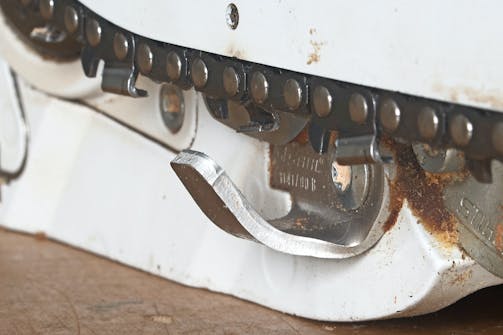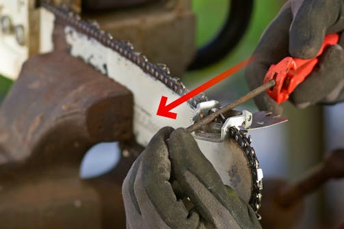 Kedjan ska vara så pass spänd att du inte kan dra den ur spåret på svärdet. Men den ska inte sitta hårdare än att den löper fritt längs med svärdet.