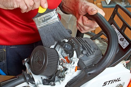 Motorkåpan tas av. Därefter rengörs kylflänsarna från sågspån och annan smuts. Använd ex. en skruvmejsel för att komma åt mellan flänsarna.