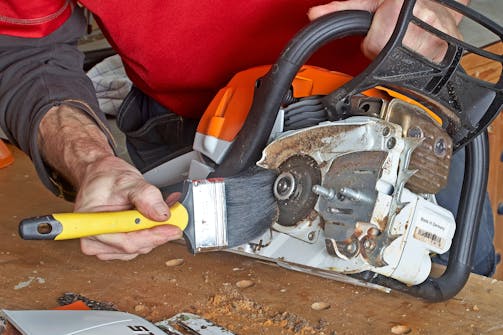 Svärdet lyfts bort och rengörs tillsammans med sågen och kedjan. Rengör med en pensel. Ge kedjan och spåret i svärdet en skvätt rostskyddande olja, och montera på svärdet igen.