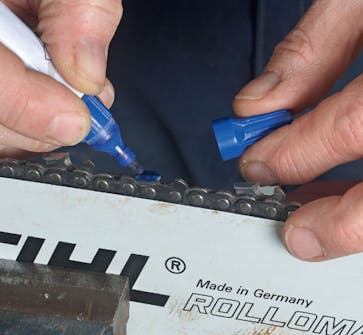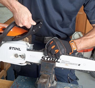 Kolla kedjespänningen. Det ska precis gå att dra kedjan för hand (använd handskar!), men den får inte hänga ner under svärdet. Se sågens bruksanvisning hur kedjan justeras.