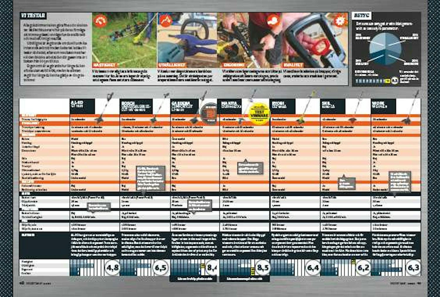 Makitas testvinnare skiljer sig från konkurrenterna på flera områden. Förutom det högre priset är de två detaljer som sticker ut mest den något längre kroppen och utformningen av skyddsskärmen. Den senare är monterad på stången istället för på motorhuset, vilket är fallet med de andra deltagarna. Detta ger en mycket bättre överblick över arbetet, men det innebär också att motorhuset snabbare blir smutsigt av gräsklippet. Vi tycker dock att det är värt priset.