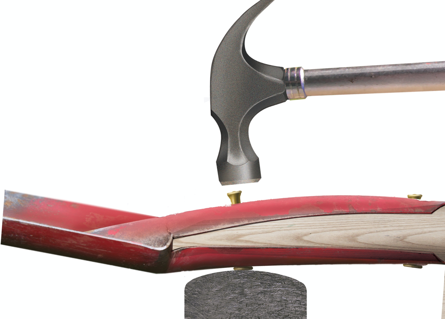 När du har anpassat det nya skaftet till spaden borrar du håll rätt igenom skaftet för nitarna. De kullriga nitarna ska stickas in från spadens baksida och därefter kapas nitarna. De ska sticka ut så mycket på framsidan som 1,5 gång nitens diameter. Knacka sedan fast nitarna mot ett hårt underlag.